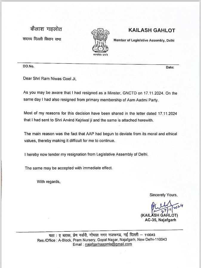 ஆம் ஆத்மியில் இருந்து பாஜவில் இணைந்த கைலாஷ் கெலாட், முன்னதாக தனது அமைச்சர் பதவியை ராஜிநாமா செய்திருந்த நிலையில், இன்று(நவ. 27) தனது சட்டமன்ற உறுப்பினர் பதவியையும் ராஜிநாமா செய்துள்ளார்.