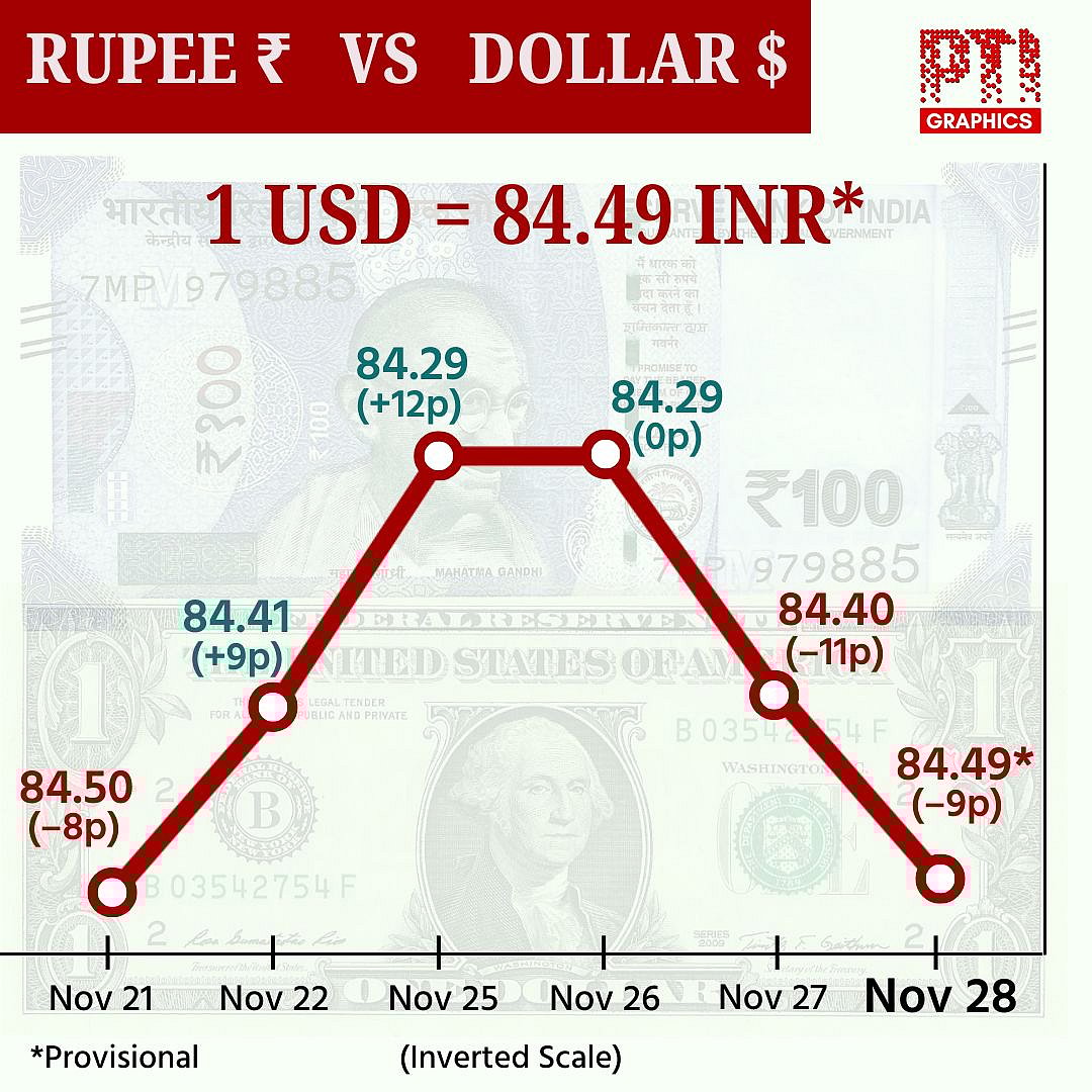 அமெரிக்க டாலருக்கு நிகரான இந்திய ரூபாய் மதிப்பு இன்று (நவ. 27) 9 காசுகள் சரிந்து ரூ. 84.49 ஆக நிர்ணயிக்கப்பட்டுள்ளது.