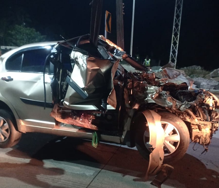 லாரியும் காரும் நேருக்கு நேர் மோதிக் கொண்டதில் லாரிக்கு அடியில் சிக்கி அடையாளமின்றி உருக்குலைந்த கார்.