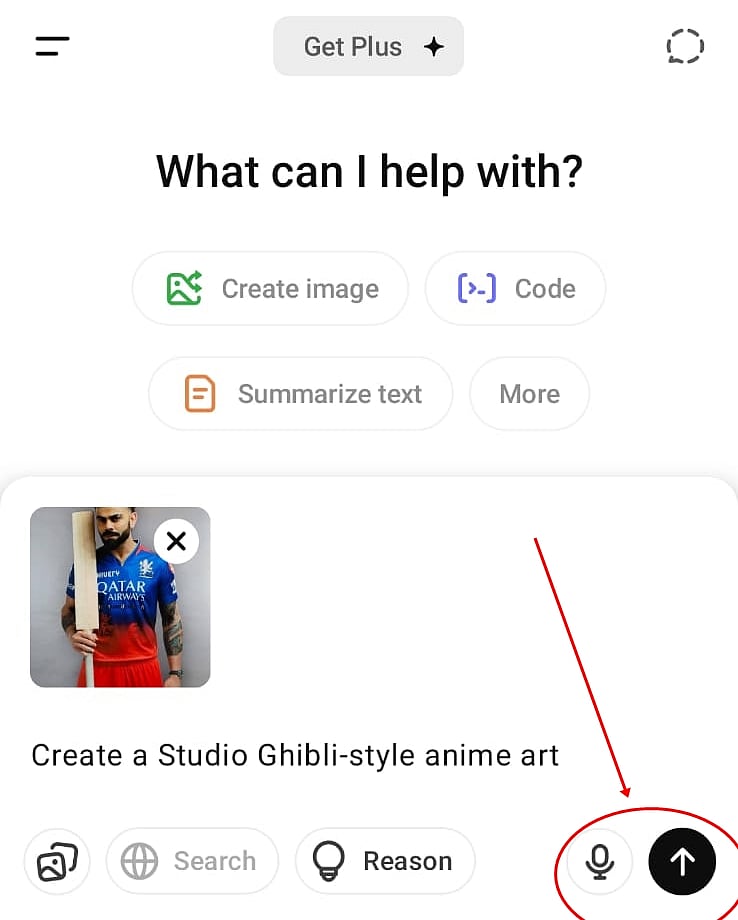 படிநிலை-4: உங்கள் கேலரியில் இருக்கும் புகைப்படம் ஒன்றை அதில் பதிவேற்றிவிட்டு “Create a Studio Ghibli-style anime art” என்று பதிவிட்டு அம்புக்குறி போன்ற பொத்தானை அழுத்த வேண்டும்.