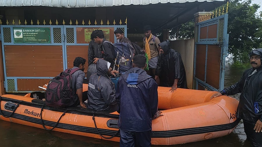 குமரன் நகர் மூன்றாவது பிரதான சாலையில் மீட்புப் பணியில் ஈடுபட்ட மீட்புப் படையினர்
