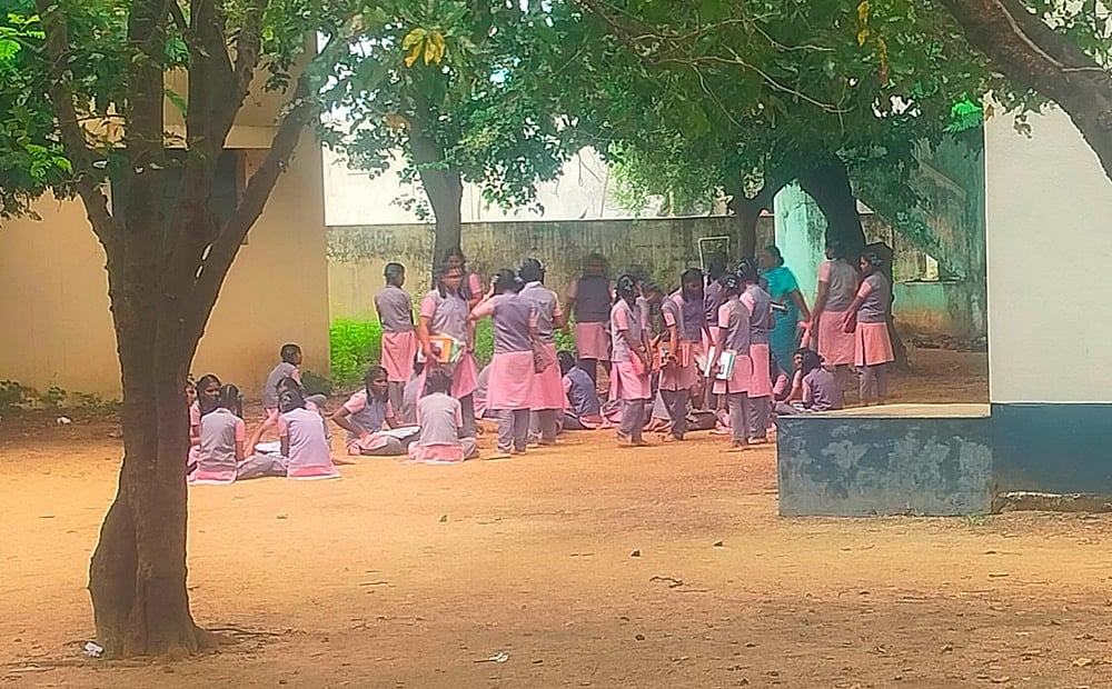 மைதானத்தில் தரையில் அமர்ந்து படித்து வரும் மாணவ, மாணவியர்