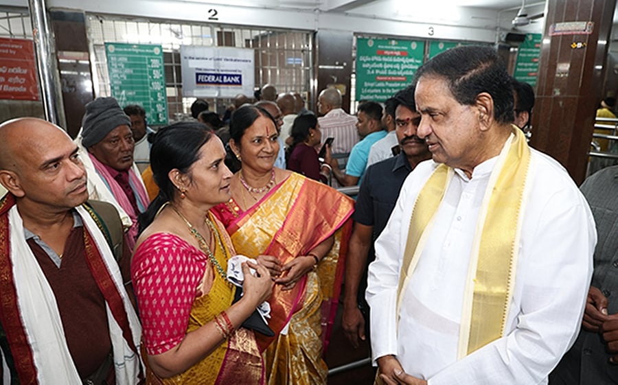 திருமலை லட்டு கவுண்டரை ஆய்வு செய்யும் தேவஸ்தான தலைவா் பி.அா். நாயுடு.
