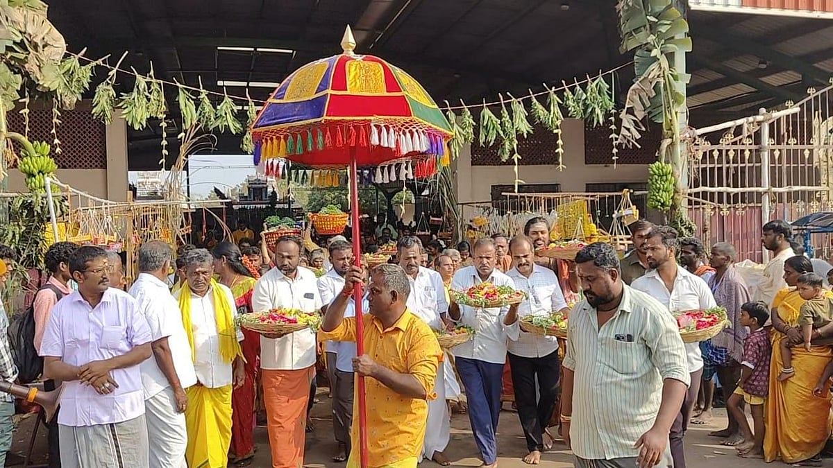 ஆதி மாரியம்மன் கோயில் வளாகத்திலிருந்து பக்தர்கள் பூத்தட்டுகளுடன் தேரோடும் வீதிகளில் ஊர்வலமாக வந்து அம்மனுக்கு பூக்களைச் சாற்றினர்