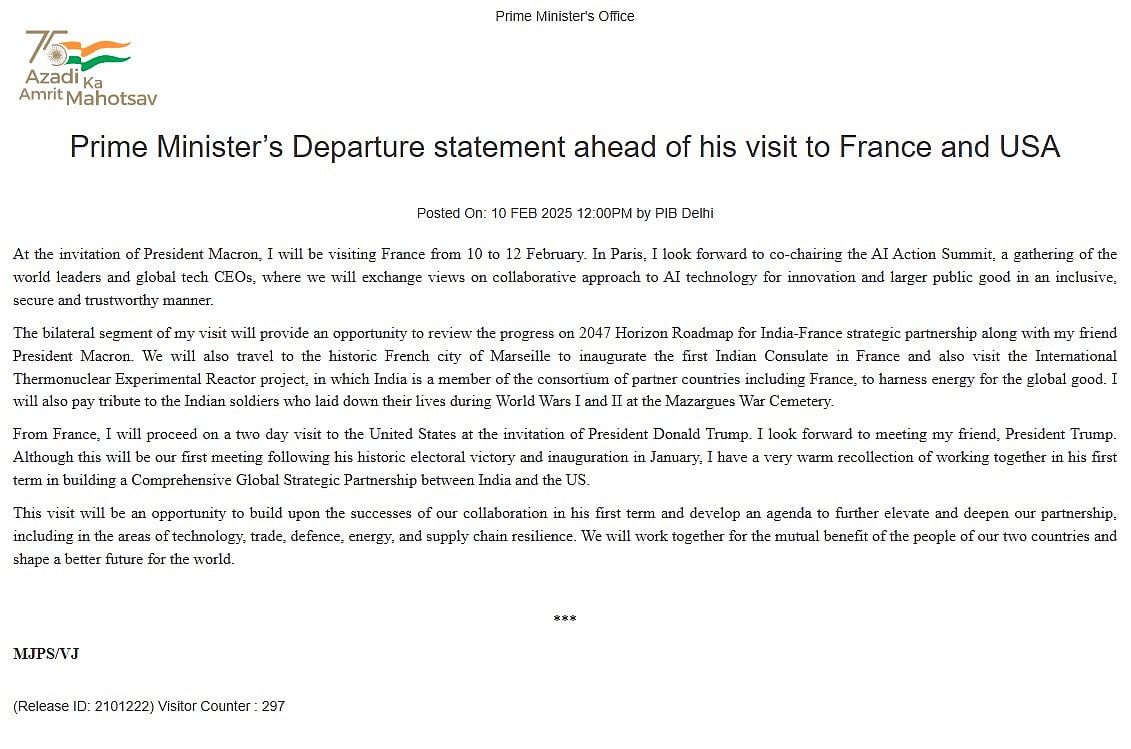 அமெரிக்க பயணத்துக்கு முன்பாக, பிரான்ஸ் நாட்டுக்கு புறப்பட்டுள்ள பிரதமா் மோடி, அந்நாட்டு அதிபா் இமானுவல் மேக்ரானுடன் சா்வதேச செயற்கை நுண்ணறிவு செயல்பாட்டு உச்சி மாநாட்டில் பங்கேற்கவுள்ளார்.