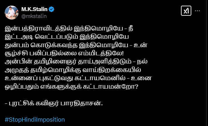 ஹிந்தி மொழியைப் புகட்டுவது கட்டாயமெனில் அதனை ஒழிப்பதும் கட்டாயம் என்ற பாரதிதாசனின் வரிகளை முதல்வர் மு.க. ஸ்டாலின் பகிர்ந்துள்ளார்.