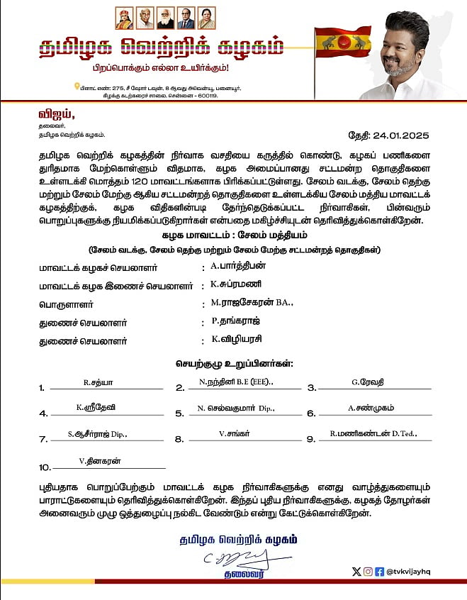 தவெக மாவட்டப் பொறுப்பாளர்கள் நியமனம்: விஜய்