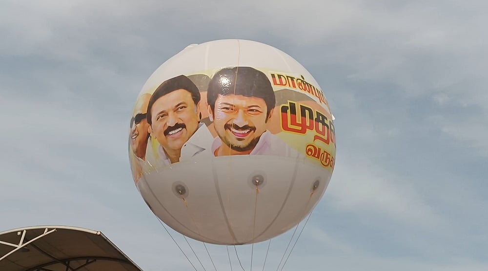 முதல்வரை வரவேற்கும் வகையில் தஞ்சை பழைய பேருந்து நிலையத்தில் முதல்வர் மற்றும் துணை முதல்வர் உருவம் பொறித்த ராட்சத பலூன் பறக்க விடப்பட்டது.