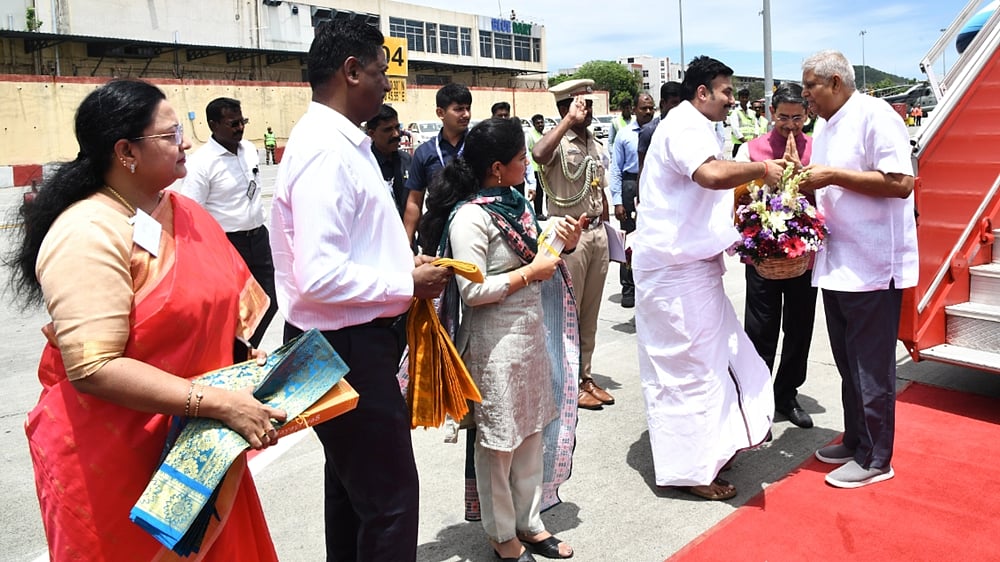 சென்னைக்கு ஞாயிற்றுக்கிழமை வந்த குடியரசு துணைத் தலைவா் ஜகதீப் தன்கரை வரவேற்ற ஆதிதிராவிடர் நலத் துறை அமைச்சர் மருத்துவர் மா.மதிவேந்தனர், ஆளுநர் ஆர்.என். ரவி, மேயர் ஆர்.பிரியா, நாடாளுமன்ற உறுப்பினர்கள் என்.ஆர். இளங்கோவன், கனிமொழி சோமு, தலைமைச் செயலாளர் நா.முருகானந்தம் உள்ளிட்டோர்.