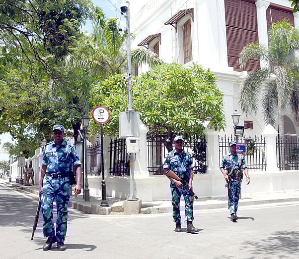 குடியரசு துணைத் தலைவா் ஜகதீப் தன்கா் தங்குவதையொட்டி புதுச்சேரி கடற்கரை சாலையில் உள்ள நீதிபதி விருந்தினா் மாளிகையில் பகுதியில் போடப்பட்டுள்ள தூப்பாகி ஏந்திய போலீஸ் பாதுகாப்பு