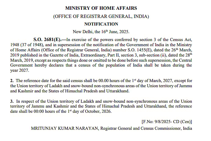 2027-இல் மக்கள்தொகை கணக்கெடுப்பு: மத்திய அரசு அறிவிக்கை வெளியீடு