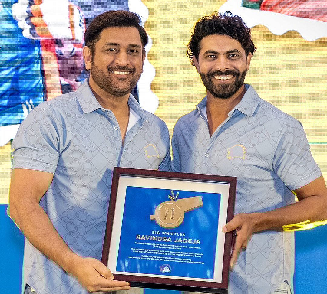 எம். எஸ். தோனி ஜடேஜாவுக்கு நினைவுப்பரிசு வழங்கி கௌரவித்தார்.
