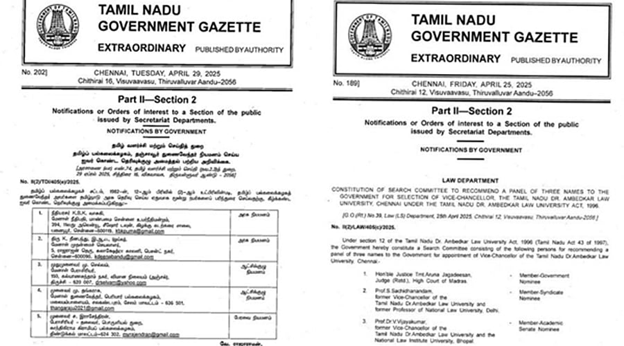 அம்பேத்கர் சட்ட பல்கலை மற்றும் தஞ்சாவூர் தமிழ் பல்கலைக்கழகத்திற்கு புதிய துணை வேந்தர்களை தேர்ந்தெடுக்க தேடுதல் குழு அமைத்து தமிழ்நாடு அரசு அரசாணை வெளியிட்டுள்ளது.