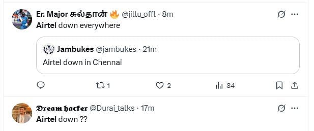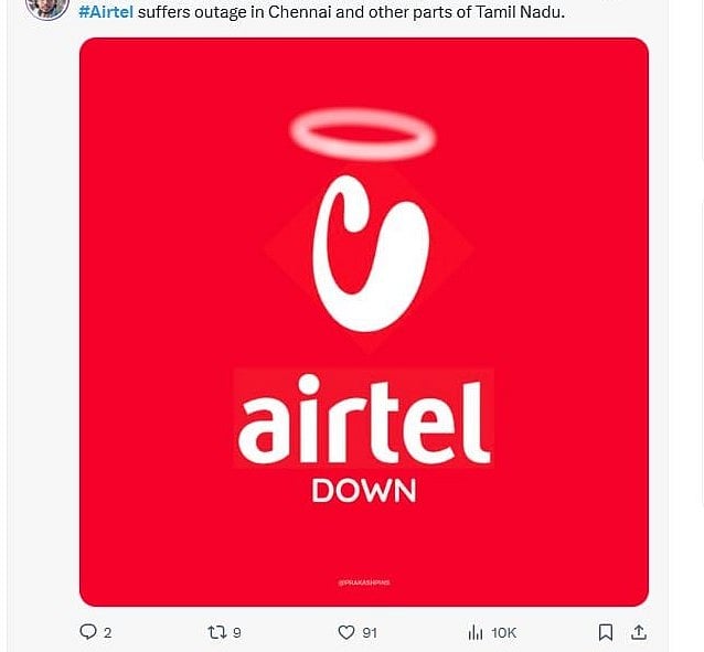 இதனிடையே அந்நிறுவனத்தின் சேவையில் பாதிப்பு ஏற்பட்டுள்ளதாகப் பயனர்கள் பலர் புகார் தெரிவித்து வருகின்றனர். இது குறித்து ஏர்டெல் நிறுவனம் சார்பில் எந்தவித கருத்தும் இதுவரை தெரிவிக்கப்படவில்லை.