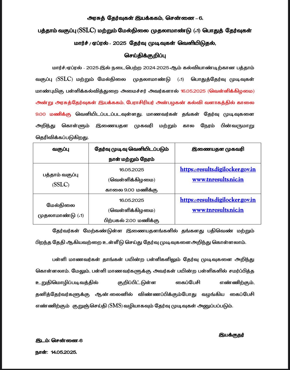 அதன்படி மே 16 (வெள்ளிக்கிழமை) காலை 9 மணிக்கு 10 ஆம் வகுப்பு தேர்வு முடிவுகளும் பிற்பகல் 2 மணிக்கு 11 ஆம் வகுப்பு தேர்வு முடிவுகளும் வெளியாகும் என்று அறிவிக்கப்பட்டுள்ளது.