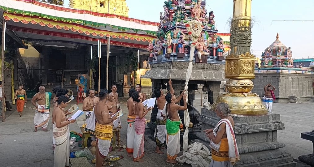 தங்கக் கொடி மரத்திற்கு சிறப்பு பூஜைகள் செய்து சிவபெருமானின் வாகனமாகிய நந்தியின் உருவம் பொறித்த கொடி தங்க கொடிமரத்தில் ஏற்றி வைக்கப்பட்டது. - டிஎன்எஸ்