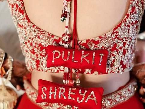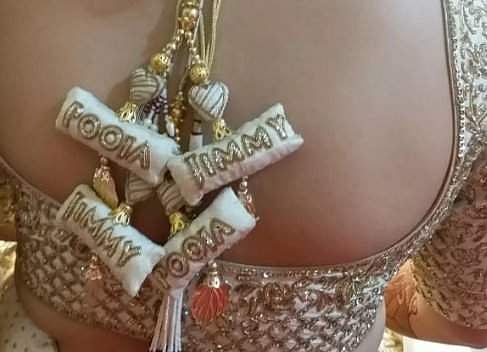 இந்த மணப்பெண் அணிந்திருக்கும் ரவிக்கையின் முதுக்குப்புறம் இது. ஐய்யோ... இதென்ன திறந்த முதுகுல இப்படிப் பேரை எழுதி வச்சுருக்காளேன்னு யாரும் திட்டிடாதீங்க. அது திறந்த முதுகு இல்லை. இதுக்கு பேர் Sheer Blouse Design, அதாவது, பழைய படங்கள்ள நடிகைகள் அரசிளங்குமரியா வேஷம் கட்டும் போது உடலின் திறந்த பகுதிகள் வெளியே தெரியா வண்ணம் ஏதோ ஒரு மெட்டீரியலில் ஸ்கின் மாதிரி ஒரு அங்கி மாட்டி இருப்பாங்க. நம்ம கண்ணுக்கு அது தோல் மாதிரி தெரிஞ்சாலும், அங்கே தோலை விட மெல்லிய சல்லாத்துணியால் சருமம் மூடப்பட்டிருக்கும். பார்க்க திறந்த முதுகு போலத் தெரிந்தாலும் அங்கே துணி மூடியிருக்குன்னு தான் அர்த்தம், அந்த மாதிரி சல்லாத்துணியில் டிசைன் செய்யப்பட்டது தான் இந்த ரவிக்கை. அட, எதுக்கு இந்த கர்மம்?! பேசாம அழகா ரவிக்கை தச்சு போட்டுக்கலாமேன்னு நீங்க சொல்றது எனக்கு கேட்குது! ஆனாலும், பாருங்க. இதுக்குப் பேர் தான் ஃபேஷன் படுத்தும் பாடு. அதனால தான் மணப்பெண்கள் வித்யாசம்க்ற பேர்ல இப்படியெல்லாம் யோசிக்கிறாங்க.