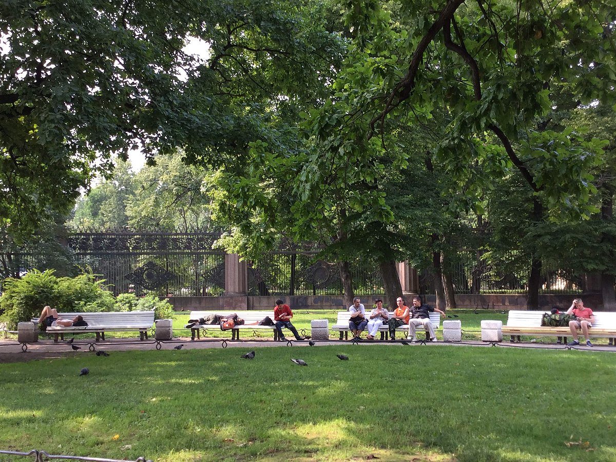 சிற்றுண்டியை முடித்துக் கொண்டு காலை பத்து மணி அளவில் நகர் உலாவுக்குச் செல்ல ஆயத்தமானோம். ரஷ்யாவின் அரசியல் தலைநகராகக் கம்பீர மிடுக்குடன் – ஸ்டாலினிய பாணிக்கட்டிடங்களோடு தோற்றம் தந்த மாஸ்கோவுக்கு மாறாகப் பன்முக எழில் உருவ அமைப்புக்கள் பலவற்றோடு எங்களை வரவேற்றது செயிண்ட் பீட்டர்ஸ்பர்க். இங்கும் கூட மாஸ்கோ போலவே அடுக்குமாடிக் குடியிருப்புக்களும், அலுவலகங்களும், வணிக வளாகங்களும் நிறைந்து கிடந்தாலும், மக்கள் நடமாட்டம் கொஞ்சம் அதிகமான உயிர்ப்போடு இருந்ததைக் காண முடிந்தது. சாலைகளின் ஒட்டத்திலேயே இடையிடையில் குறுக்கிடும் பசுமையும், தூய்மையுமான பூங்காக்கள்! அங்கே உள்ள இருக்கைகளில், புல் தரைகளில் ஓய்வாக, உல்லாசமாகப் பொழுதுபோக்கும் உள்ளூர் மற்றும் சுற்றுலாப் பயணிகள்!