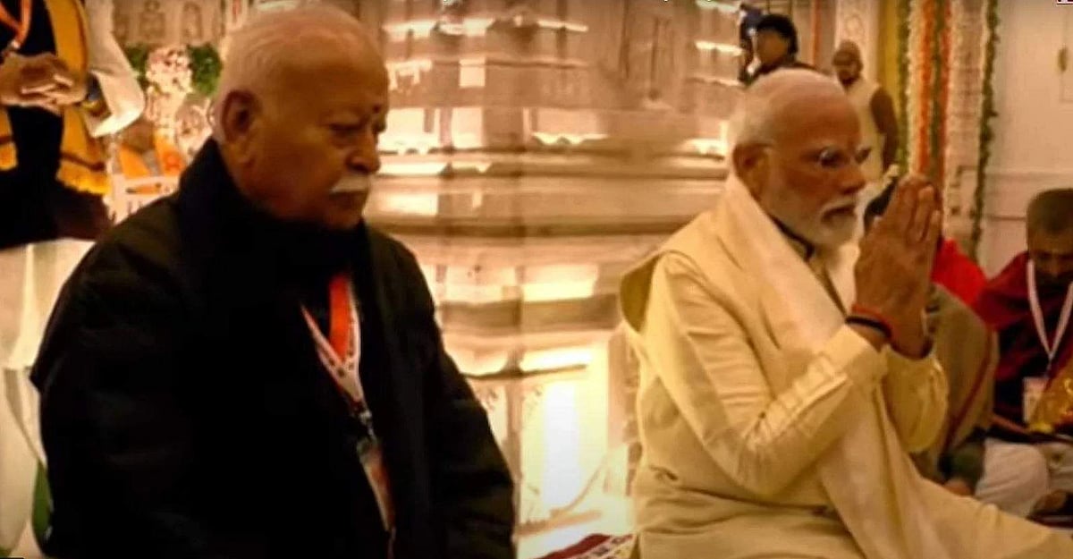 அயோத்தி ராமர் கோயிலில் தொடங்கிய ஸ்ரீபால ராமர் சிலை பிராண பிரதிஷ்டை தொடங்கி சிலை பிரதிஷ்டை நடைபெற்று வருகிறது. பிரதமர் நரேந்திர மோடி பூஜைகளை தலைமையேற்று செய்தார். அவருடன் ஆர்.எஸ்.எஸ். தலைவர் மோகன் பாகவத் அமர்ந்திருந்தார்.