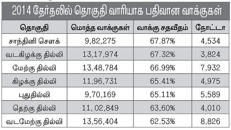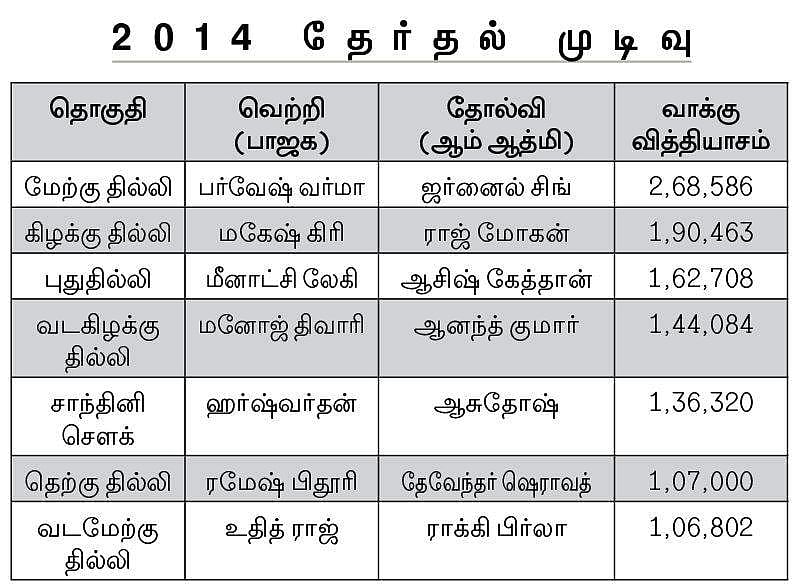 கடந்த 2014 மக்களவைத் தேர்தலில் தில்லியில் உள்ள ஏழு தொகுதிகளிலும் பாஜக வெற்றி பெற்றது. தொடர்ந்து மூன்று முறை தில்லி மாநிலத்தில் ஆட்சி செய்த காங்கிரஸை அனைத்துத் தொகுதிகளிலும் பின்னுக்குத் தள்ளிஆம் ஆத்மி கட்சி இரண்டாம் இடத்துக்கு வந்தது. ஆனால், காங்கிரஸ், ஆம் ஆத்மி ஆகிய இரண்டு கட்சிகளும் பெற்ற மொத்த வாக்குகள் பாஜக பெற்ற வாக்குகளைவிட சற்று அதிகமாகும்.