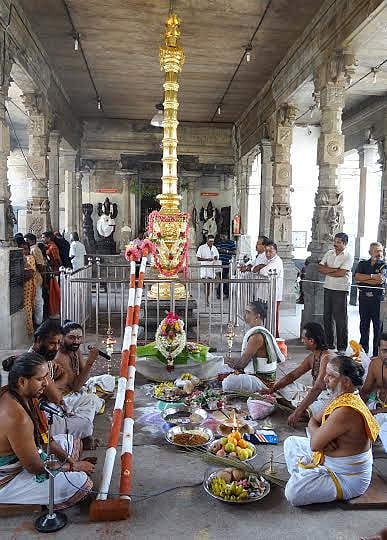 இந்நிலையில் இக்கோயிலுக்கு வரும் செப்.7ம் தேதி கும்பாபிஷேகம் செய்ய தீர்மானிக்கப்பட்டுள்ள நிலையில் யாகசாலை பூஜைகள் துவங்க ஏதுவாக வெள்ளிக்கிழமை முகூர்த்தக்கால் நடுதல் துவங்கியது. காலை 9மணியளவில் தங்கக்கொடி மரம் முன்பு முகூர்த்க்கால்கள் வைக்கப்பட்டு சிறப்பு பூஜைகள் நடத்தப்பட்டது.
