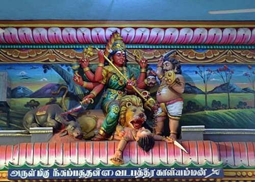அவளது வலது அடி துண்டிக்கப்பட்ட ஒரு தலையின்மீது ஊன்றப்பட்ட நிலையில் உள்ளது. இச்சிற்பத்தினைப் போன்ற வடிவம் தமிழகத்தில் வேறு எங்கும் கிடையாது. இவளை வடபத்ர காளி என்றும், ராகுகால காளி என்றும் அழைக்கின்றனர்.