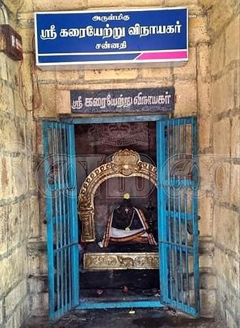 உடனே ஆற்று மணலிலேயே விநாயகப் பெருமானது உருவத்தைச் சிருஷ்டி செய்து, அவரிடத்தே பிழை பொறுத்துக் காக்க வேண்டினர். இதனால் மனமிரங்கிய விநாயகரும் ஆற்று வெள்ளத்தைத் தணித்துத் தேவர்களைக் கரையேற்றினார். அப்போது முதல், இத்தலத்து விநாயகர் 'கரையேற்று விநாயகர்' என்ற நாமம் தாங்கி அருளி வருகிறார் என்கிறது தல வரலாறு.