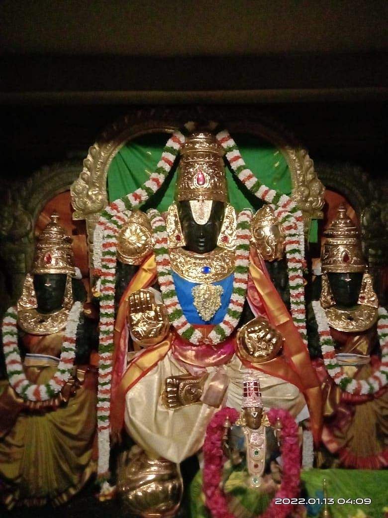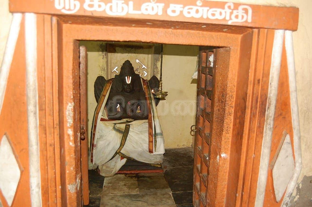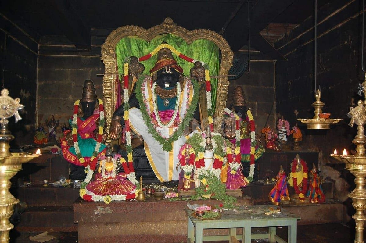 இக்கோயில் கருவறையில் அமர்ந்த ஆழியும், சங்கும் ஏந்திய திருமாலும், ஸ்ரீதேவி, ஸ்ரீபூதேவி இருவரும் மிகப்பெரிய திருவுருவங்களாக இடம்பெற்றுள்ளனர். இத்திருக்கோயிலைத்தான் நம்மாழ்வார், திருமங்கை ஆழ்வாரால் மங்களாசாசனம் செய்யப்பட்டது.