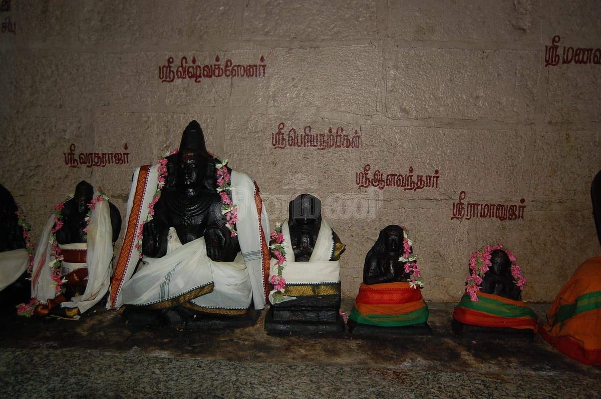 முக மண்டபத்து தூண்கள் இரண்டில் முறையே அனுமன் பர்வதம் ஏந்தும் கோலமும், அவன் தன் வால் சுருளின் மீது அமர்ந்துள்ள கோலமும் செதுக்கப்பட்டுள்ளன. தேசிகன் சன்னதியில் உள்ள இராமானுஜர், கூரத்தாழ்வார் மற்றும் ஆழ்வார் பதின்மர் சிலைகளும் பிற்காலத்தவை.