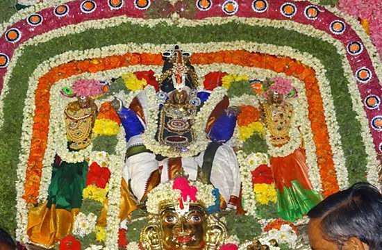 நரஸிம்ம ஜெயந்தி விழாவின் தொடக்க நாளன்று நரஸிம்ம ஸ்வாமி பிம்பத்திற்கு (அத்திமரக்கட்டையில் செய்தது) ப்ராணப்பிரதிஷ்டை என்னும் விசேஷ பூஜை அசுரசந்தியா கால (மாலை 6 மணிக்குள்) வேளையில் நடத்தப்படும். பின்னர் ஸ்ரீ பூமி நீளா சமேத ஸ்ரீநிவாஸப் பெருமாளுக்கு வசந்த மாலை சாற்றி இரவு 8 மணிக்கு கருடஸேவையில் வீதியுலா நடைபெறும். அக்ரஹார நடுவில் போடப்பட்டுள்ள விசேஷ பந்தலில் பெருமாளை ஏளப்பண்ணுவார்கள். 'தட்டுச்சுத்து' என்னும் பல சொல்லு கட்டுகள் அபிநயத்துடன் ஆடப்பட்டு தீபப்பிரதிட்சணம் நடைபெறும்.