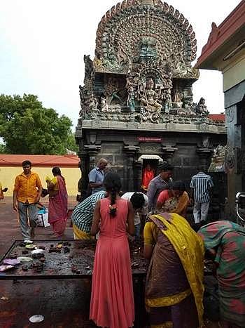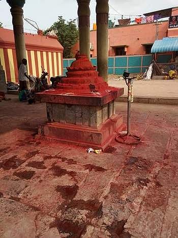 பண்டைய அரசர்கள் பலரும் போருக்குச் செல்வதற்கு முன்னரும், வெற்றிவாகை சூடிவந்த பின்னரும், அரசு சார்பாக மேற்கொள்ளப்படும் முக்கிய செயல்பாடுகளின் போதும் முதலில் காளியை வழிபடுவதை வழக்கமாகக் கொண்டிருந்தனர் காளியின் அருகில் போரில் வெற்றி அடைவதற்காக தமது தலையையே தருவதாக வேண்டிக் கொண்ட படையினர் சிரதானம் செய்யும் சிலைகள் உள்ளன. அவற்றில் வீரபெருமாள் என்பாரும் ஒருவர். காளியின் எதிர்புறம் உள்ள சுவற்றில் சோழ மன்னர்கள் வணங்குவது போன்ற சிலைகள் உள்ளன.
