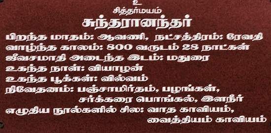 "சுந்தரானந்தர்" நம்மை சுண்டி இழுக்கிறார். சுந்தரானந்தர் 16-ம் நூற்றாண்டில் வாழ்ந்த சித்தர். போகமுனி என்னும் சித்தரின் மாணாக்கர். கிஷ்கிந்தையில் வாழ்ந்த நவகண்ட ரிஷியின் பேரன் என்றும், கள்ளர் குலத்தை சேர்ந்தவர் என்றும் போகர் சொல்கிறார். இவர் மிகவும் அழகான தோற்றத்தைக் கொண்டிருந்ததால் சுந்தரானந்தர் என்று அழைக்கப்பட்டார். இவருக்கு வல்லப சித்தர் என்கிற பெயரும் உண்டு. இவர் தனது இளமைக்காலத்தில் பெற்றோர் விருப்பப்படி இல்லற வாழ்க்கையை மேற்கொண்டார் என்றும், சட்டை முனியால் ஆட்கொள்ளப்பட்டு பின்னர் அவருடனே சென்றதாகவும் சொல்லப்படுகிறது. இவர் அகத்தியர் பூஜித்த லிங்கத்தை வாங்கி அதை சதுரகிரியில் பிரதிட்டை செய்து வழிபட்டுள்ளார் என்றும் சொல்லப்படுகிறது. இவர் மதுரையிலே சமாதியடைந்ததாக சொல்லப்படுகிறது. மதுரை மீனாட்சி அம்மன் கோவிலில் இவருக்குத் தனி சந்நிதி அமைந்திருக்கிறது.