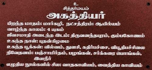 முதன் முதலாய் தரிசிப்பது, சித்தருக்கெல்லாம் தலைமை சித்தராய் விளங்கும் "அகத்தியர் பெருமான்". திருநீற்றுச் சின்னங்களுடன் ருத்திராட்சம் அணிந்து, கமண்டலத்துடன் ஒய்யாரமாக அமர்ந்த நிலையில் இருக்கிறார். அகத்தியர் பற்றி நாளெல்லாம் பேசிக் கொண்டே இருக்கலாம். அன்பின் ஆழம் அவர். கருணையின் காந்தம் அவர். அவரது பரிபூரண ஆற்றல் நம்மை இன்னும் வழிநடத்திக் கொண்டிருக்கிறது.