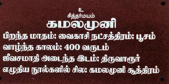 அடுத்து "கமலமுனி" தரிசனம். இவர் போகரிடம் சீடனாய் சேர்ந்து யோகம் பயின்று, சித்தர் கூட்டத்துள் ஒருவராய்ப் புகழ் பெற்றார். "கமலமுனி முந்நூறு'' என்னும் மருத்துவ நூல், ரேகை சாஸ்திரம் முதலிய நூல்களை இவர் செய்துள்ளதாகத் தெரிகின்றது. காப்பான கருவூரார் என்று தொடங்கும் காப்புப்பாடல் கமலமுனி அருளியது.