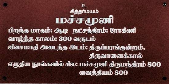 அடுத்து திருப்பரங்குன்றத்தில் அருள் பாலிக்கும் "மச்ச முனி". மச்சமுனி காகபுசுண்டரின் சீடராவார். சிவபெருமான் "காலஞானத்தை" உமாதேவியாருக்கு உபதேசிக்கும் பொது இடையில் அவர் தூங்கி விட்டாராம். ஆனால் ஆரம்பத்தில் இருந்து இறுதி வரையில் கேட்டுக் கொண்டிருந்த மீன் ஒன்று, மீதி ஞானத்தைத் தெரிந்து கொள்ளப் பூமியில் பிறந்ததாகவும் அதுவே மச்ச முனி என்கிற புராணகால கதை ஒன்றும் சொல்லப்படுகிறது. மச்சமுனி சித்தர் மீனாக நீந்தும் தலம் மதுரை திருப்பரங்குன்றத்தில் இருக்கின்றது. மச்சமுனி சூத்திரம் 21 தொடங்கி சுமார் இருபது நூல்கள் உள்ளது. மேலே சில நூல்கள் தான் கூறப்பட்டுள்ளது.