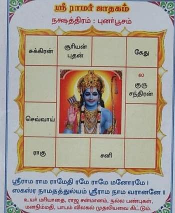ஸ்ரீ ராமபிரான் புணர்பூச நட்சத்திரத்தில் கடக ராசி மற்றும் லக்னத்தில் ஜெட ஜென்ம ராசியில் பிறந்தவர். லக்னத்தில் குரு உச்சம் பெற்று ஸ்ரீ ராமர் தெய்வீகத்தன்மையோடும் சாஸ்திரம் பிறழாமலும் வாழ காரணமாகி நின்றார். இரண்டுக்குடைய சூரியன் மேஷத்தில் உச்சம் அடைந்து சூரிய குல திலகமாக விளங்கினார். மூன்றுக்குடைய புதன் சூரியனுடன் சேர்க்கைப் பெற்று புத ஆதித்ய யோகம் பெற்றிருந்ததால் கல்வி, கேள்வி, ஆய கலைகள் அனைத்தும் அவரிடம் தஞ்சம் அடைந்து பணிந்து நின்றன என்றால் மிகையில்லை. ஆனாலும் ஒரு துளிகூட கர்வம் இல்லாமல் மனிதனாக பிறந்த தெய்வமாக விளங்கினார்.