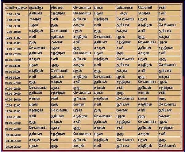 உதாரணமாக ஞாயிறு காலை முதல் ஒரு மணி நேரம் 6-7 சூரியனின் ஹோரை அதற்கடுத்து 7-8 மணி வரை சுக்கிரன் ஹோரை, 8-9 மணி வரை புதன் ஹோரை, 9-10 வரை சந்திரன் ஹோரை, 10-11 வரை சனி ஹோரை, 11-12 மணி வரை குரு ஹோரை, 12-1 மணி வரை செவ்வாய் ஹோரை. இதன் சுழற்சியாக மீண்டும் சூரியன் ஹோரை துவங்கும். ஹோரையின் தோராயணமான கட்டம் தெளிவாக கீழே குறிப்பிட்டுள்ளது. ஒவ்வொரு நாளும் சூரிய உதயம் இடத்திற்கு இடம் மாறுபடும் சில விநாடிகள் மட்டுமே மாற்றம் இருக்கும். கிரகங்கள் சூரினுக்கும் பூமிக்கும் இடையில் மற்றும் சூரியனுக்கு அப்பால் சுற்றும் கிரகங்கள் என இரண்டு நிலையாகப் பிரிக்கப்படுகிறது. இதில் மெதுவாக சுற்றுவது தொடங்கி வேகமாக சுற்றுவது வரை என எடுத்துக் கொள்ளப்படுகிறது.