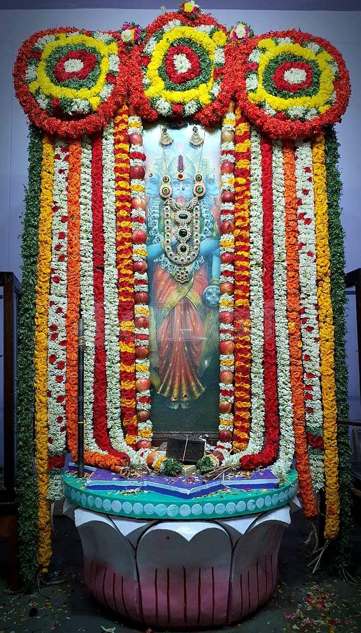அதிருத்ர சண்டீ யாகத்தின் போது திங்கள்கிழமை வெவ்வேறு விதமான மலர்களால் அலங்காரம் செய்யப்பட்டிருந்த பிரத்தியங்கிரா தேவி உருவப்படம்.