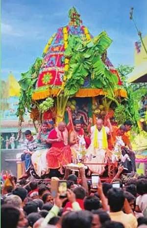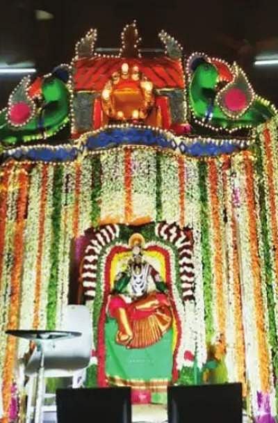 அப்போது 5 மணி நேர ஊர்வலத்தின்போது, தேரோடும் வீதிகளில் மக்கள் கூட்டம் நிறைந்து காணப்படும். அப்போது அம்மன் சிரசு மீது பல்லாயிரக்கணக்கான மக்கள் மலர்கள், பூக்கள், பூமாலைகள் போன்றவற்றை தூவி வரவேற்பது உண்டு. சிரசுவின் மீது பட்டு, சிதறும் பூக்களைப் பொக்கிஷம் போல பக்தர்கள் எடுத்துச் செல்வர்.