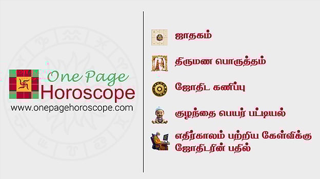 ONE PAGE HOROSCOPE என்பது ஆன்லைன் ஜாதகம் மற்றும் ஜோதிட இணையதளம் ஜோதிடத்தை புதிய தொழில்நுட்பத்துடன் சேர்த்து, சிறந்த ஜோதிடர்களை வைத்து சரியான மற்றும் ஆராய்ச்சி மூலம் சொல்லப்படும் ஜோதிட விடைகளைத் தரும் முன்னணி இணையதளமாகும். தேர்ச்சி பெற்ற ஜோதிடர்கள் மற்றும் நவீன தொழில்நுட்பத்தை இணைத்து விரைவானதும் நம்பக்கூடியதுமான ஜோதிட சேவைகளை நம் தளம் தந்து வருகிறது. தமிழ் உள்பட பல மொழிகளில் கொடுக்கப்படும் இந்த சேவைகள், ஜாதகம் பார்த்தல், திருமணப் பொருத்தம், குழந்தைக்கு பெயர் தேர்வு செய்தல் போன்ற பல தேவைகளைப் பூர்த்தி செய்கிறது. உயர்ந்த பாதுகாப்பு முறைகளுடன் செயல்படும் இந்த தளம், இந்தியா மற்றும் வெளிநாடுகளில் வாழும் லட்சக்கணக்கான பயனாளர்களின் நம்பிக்கைக்கு உரியதாக உள்ளது.