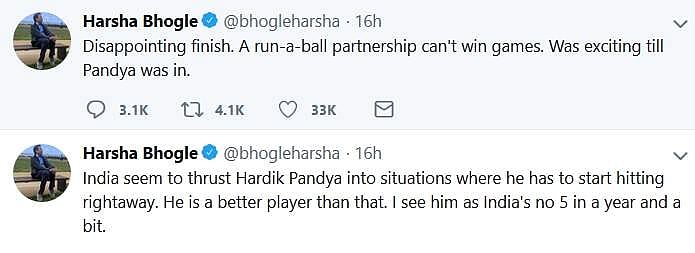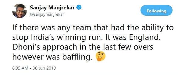 இந்நிலையில் நேற்றைய ஆட்டத்தில் தோனியின் பேட்டிங் மற்றும் அவருடைய முயற்சி குறித்து கடும் விமரிசனங்கள் எழுந்துள்ளன. பாண்டியா ஆட்டமிழந்தபிறகு இந்தியாவின் இன்னிங்ஸ் வெற்றியை நோக்கிப் பயணிக்கவில்லை. இங்கிலாந்து அணி 13 சிக்ஸர் அடித்த நிலையில் இந்திய அணி 1 சிக்ஸர் மட்டுமே அடித்தது. கடைசி 5 ஓவர்களில் தோனியும் ஜாதவும் சேர்ந்து 20 சிங்கிள்கள், 3 பவுண்டரிகள், 1 சிக்ஸர் மட்டுமே அடித்தார்கள். இங்கிலாந்து அணியின் இலக்கை நெருங்க இந்த வேகம் துளியும் போதவில்லை.