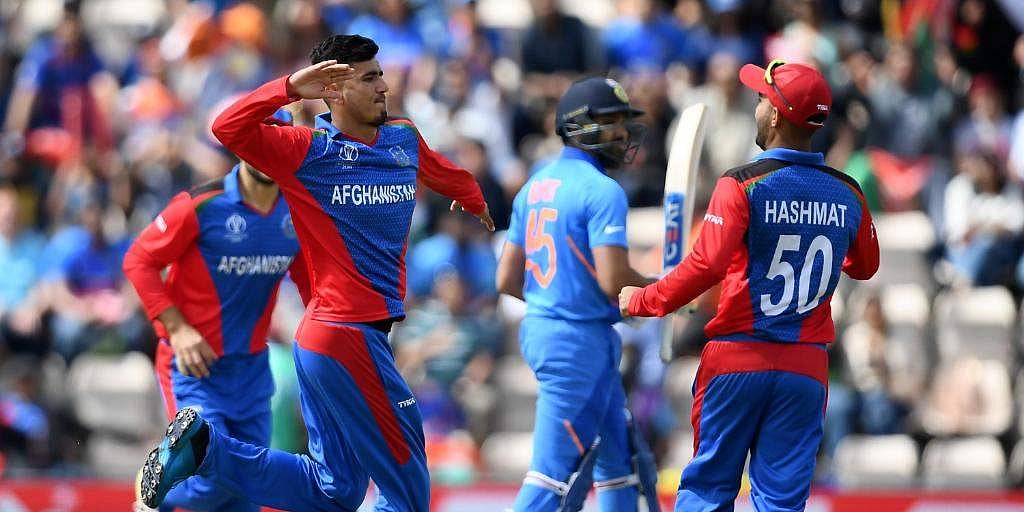 ஆப்கானிஸ்தானுக்கு எதிராகவும் இந்தியத் தொடக்க வீரர்கள் நிதானமாகவே விளையாடினார்கள். 4 ஓவர்கள் வரை 7 ரன்கள் தான் கிடைத்தன. 10 பந்துகளில் 1 ரன் மட்டும் எடுத்த ரோஹித் சர்மா, முஜீப் பந்துவீச்சில் ஆட்டமிழந்தார். இதன்பிறகு கோலி வந்து ரன் எடுக்கும் வேகத்தை அதிகப்படுத்தினார். 53 பந்துகளில் 30 ரன்கள் எடுத்த ராகுல், முகமது நபி பந்துவீச்சில் ஆட்டமிழந்தார். நான்காம் நிலை வீரராகக் களமிறங்கிய விஜய் சங்கர், கோலிக்கு நல்ல இணையாக விளங்கினார். 48 பந்துகளில் அரை சதத்தை எட்டினார் கோலி. இந்த உலகக் கோப்பைப் போட்டியில் அவர் எடுக்கும் மூன்றாவது அரை சதம் இது.