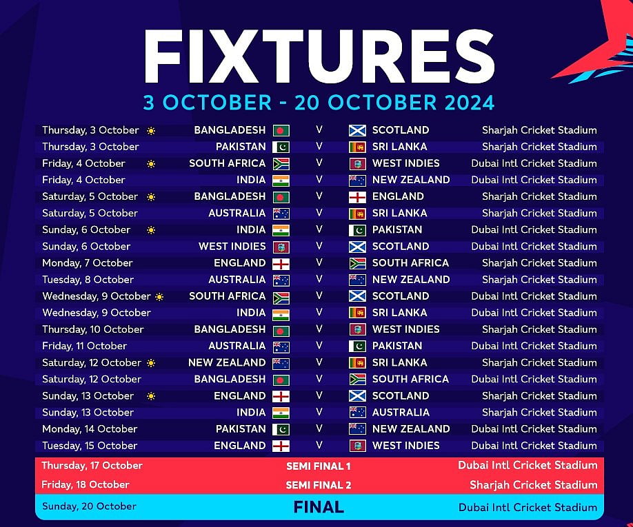 போட்டிகள் வருகிற அக்டோபர் 3 ஆம் தேதி தொடங்குகிறது. உலகக் கோப்பை போட்டிகள் முதலில் வங்கதேசத்தில் நடத்த திட்டமிடப்பட்டது. அங்கு நிலவும் அரசியல் அமைதியின்மை காரணமாக பல வீரர்களின் பாதுகாப்பு குறித்து கவலை தெரிவித்ததை அடுத்து, போட்டிகள் ஐக்கிய அரபு அமீரகத்துக்கு மாற்றப்பட்டது.