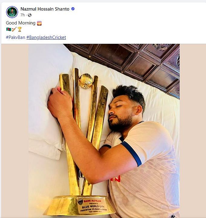 பாகிஸ்தானை அதன் சொந்த மண்ணில் வீழ்த்தி வரலாற்று வெற்றி பெற்ற வங்கதேச அணியின் கேப்டன் கோப்பையுடன் உறங்கும் புகைப்படத்தை பதிவிட்டுள்ளார்.