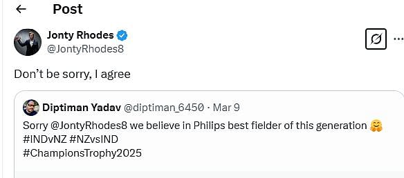 ஒருவர் எக்ஸ் தளத்தில் இந்தத் தலைமுறையின் சிறந்த ஃபீல்டர் க்ளென் பிலிப்ஸ்தான். மன்னிக்கவும் ஜான்டி ரோட்ஸ் எனக் குறிப்பிட்டிருந்தார்.