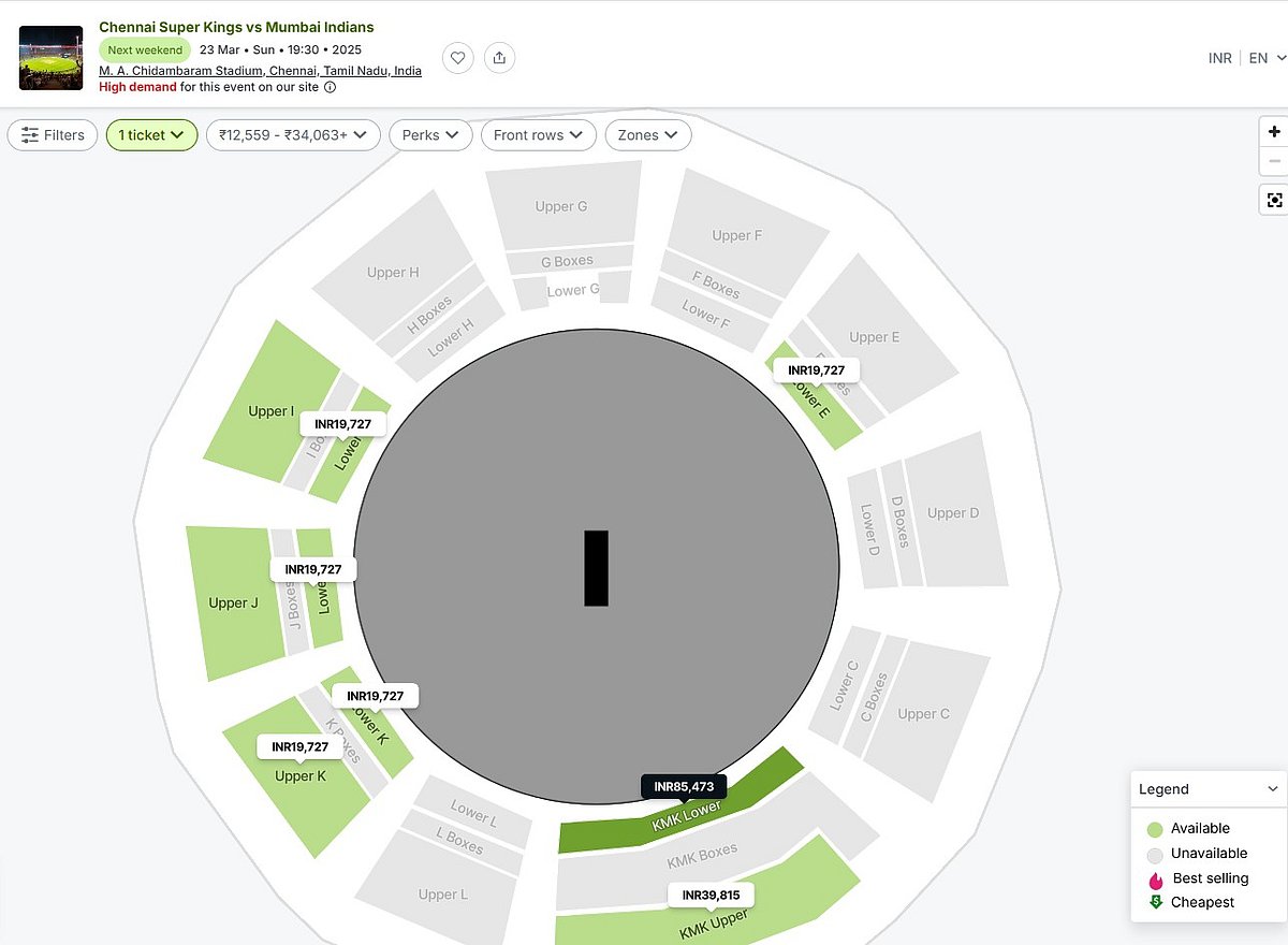 மைதானத்தின் கீழ் கேலரிக்கான டிக்கெட்டுகள் கடந்தாண்டைவிட 10 மடங்கு அதிக விலைக்கு விற்பனை செய்யப்படுகிறது. கடந்த சீசனில் டி கேலரியின் டிக்கெட் ரூ. 1,700-க்கு விற்கப்பட்ட நிலையில், தற்போது ரூ.20,600-க்கு விற்கப்படுகிறது.