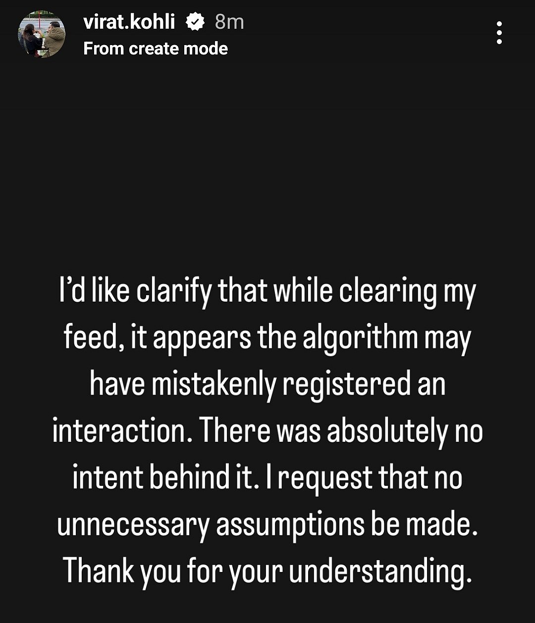 இந்நிலையில் இது குறித்து தனது இன்ஸ்டா பக்கத்தில் இதற்கு விளக்கம் அளித்துள்ளார். அதில் விராட் கோலி கூறியதாவது: