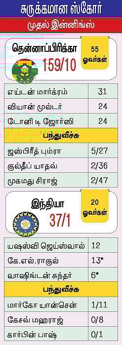 கே.எல்.ராகுல் 13, வாஷிங்டன் சுந்தா் 6 ரன்களுடன் ஆட்டமிழக்காமல் இருக்க, தொடக்க வீரா் யஷஸ்வி ஜெய்ஸ்வால் 3 பவுண்டரிகளுடன் 12 ரன்களுக்கு, யான்சென் பௌலிங்கில் ஸ்டம்ப்பை பறிகொடுத்தாா்.