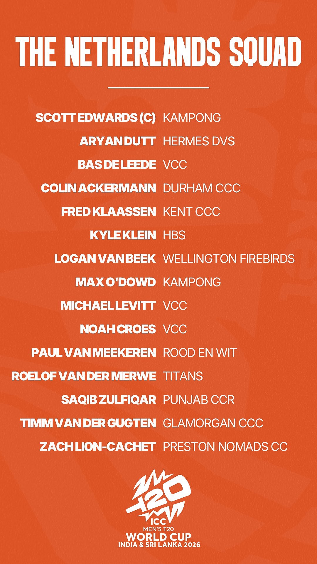 டி20 உலகக் கோப்பைத் தொடருக்கான நெதர்லாந்து அணியை அந்நாட்டு கிரிக்கெட் வாரியம் அறிவித்துள்ளது.