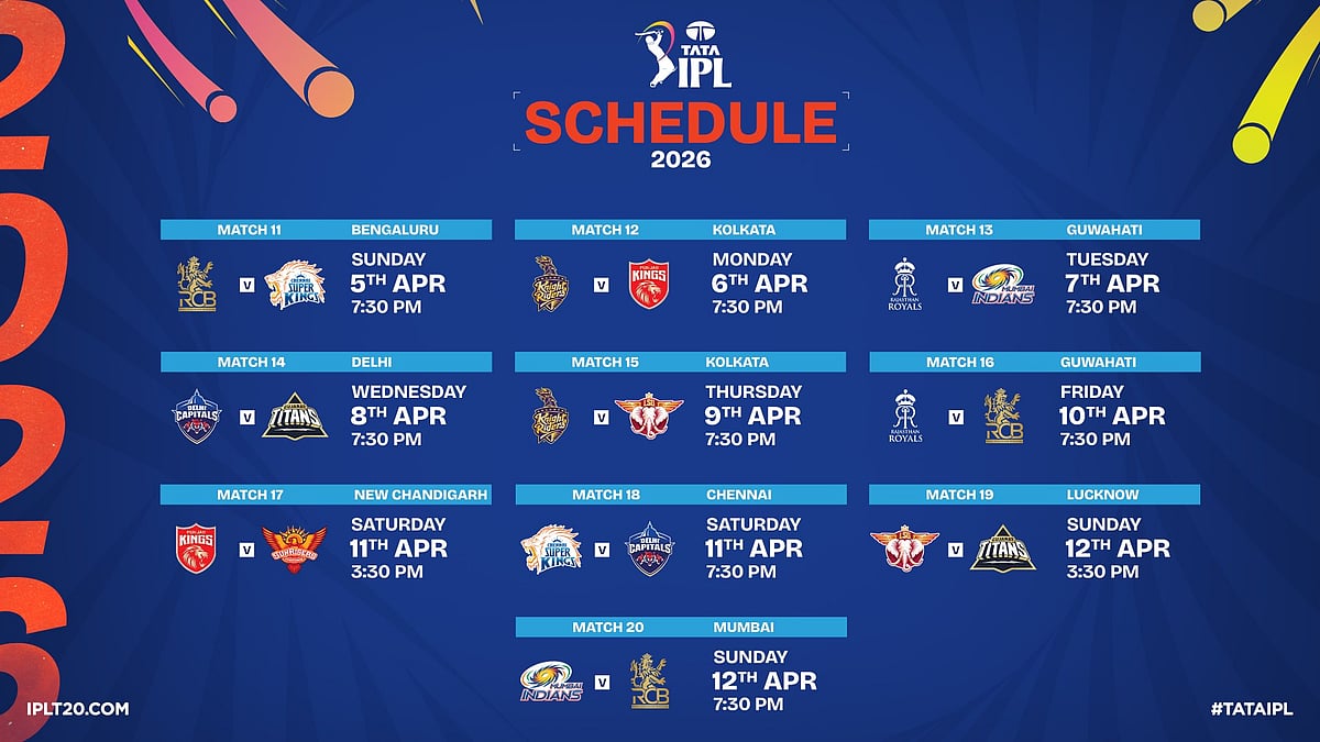 இந்தியாவில் நடைபெறும் மாபெரும் கிரிக்கெட் திருவிழாவான ஐபிஎல் தொடரின் 19வது ஆண்டு போட்டிகள் மார்ச் 28 அன்று தொடங்குகின்றன. இதில் ஏப்ரல் 12 வரை நடக்கவுள்ள 20 போட்டிகளுக்கான முதற்கட்ட அட்டவணை தற்போது வெளியாகியுள்ளது.
